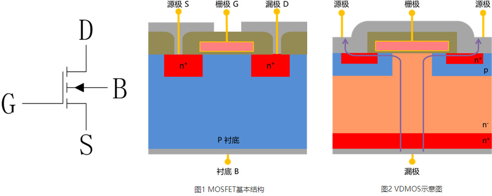 中高壓功率MOSFET通常采用垂直溝道結構,如圖2所示,器件的漏極在芯片底部,源極在芯片頂部,整個器件呈垂直結構放置。這種結構被稱為Vertical Double-diffusion MOS (VDMOS)。從結構上看VDMOS的漏極從原來的表面位置移到了器件的底部,漏極電流也相應從器件的底部流到器件的表面,變成了垂直型器件。漏極電流與溝道之間的區域是漂移區,是高壓功率器件用來耐壓的主要部分。漂移區越厚且漂移區電阻率越低,則耐壓越高,而與此同時器件的導通電阻相應的也就越高。這是因為VDMOS的Rdson 與BVdss的2~2.5次方成正比。即公式1: