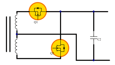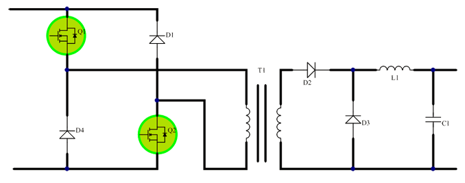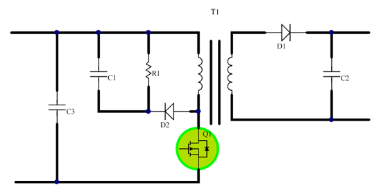 正激式開關(guān)電源在硬開關(guān)應(yīng)用中有單管正激和雙管正激兩種,對(duì)于單管正激,由于變壓器需要增加額外的磁復(fù)位繞組,在主開關(guān)MOS管關(guān)斷時(shí),MOS管會(huì)承受兩倍于輸入電壓的應(yīng)力,因此該類拓?fù)鋺?yīng)用中我們推薦高BV的MOS管,以應(yīng)對(duì)電壓變化帶來(lái)的沖擊。